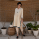 This light brown kurta features black and white hand embroidered paisley motives across the chaak with delicate floral hand embroidery on the neckline and sleeves. The kurta is finished with black hand embroidery across the chaak and daaman making it absolutely irresistable. It is paired with our tapered black pants with lace detailing and a front slit for a refined look.