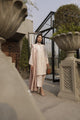 Ode' Blush comes with a flattering silhouette rendered in soft rose pink pure Raw Silk. The outfit is accented with a lotus brooch on the sleeves and the front placket. It is embellished with an indigenous monotone cut-work and patch work on the front with beautiful floral trails. This fabulously feminine design is paired with pleated hem Raw Silk pants making you exude a luminous shine and glamour!