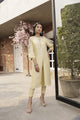 A cream pure Raw Silk set with a hand-embroidered neckline on an Organza base. The neckline is further enhanced with Silver Swarovski and zardozi detail. This A-line shirt has little tulip motif sprays with handmade button detail and is paired with our gara hand-embroidered Raw Silk Izaar. Complete this look with our kaantha hand embroidered dupatta on a Raw Silk base. This dupatta is exquisitely crafted by the women of Multan. This classic design is multifunctional and can never be outdated.