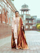 This ruby pink kallidaar bridal ensemble is a dream-worthy ode to all that is romantic and ethereal. Shades of antique gold sparkle through zardozi, sequin and crystal work. The brocade draped dupatta represents an era bygone with a complementing tangerine accent as its border. The heavily worked dupatta has Nizami bagh jaal embellished that completes the ensemble to perfection. Make a subtle statement in this ensemble that is perfect for an eventide celebration.