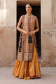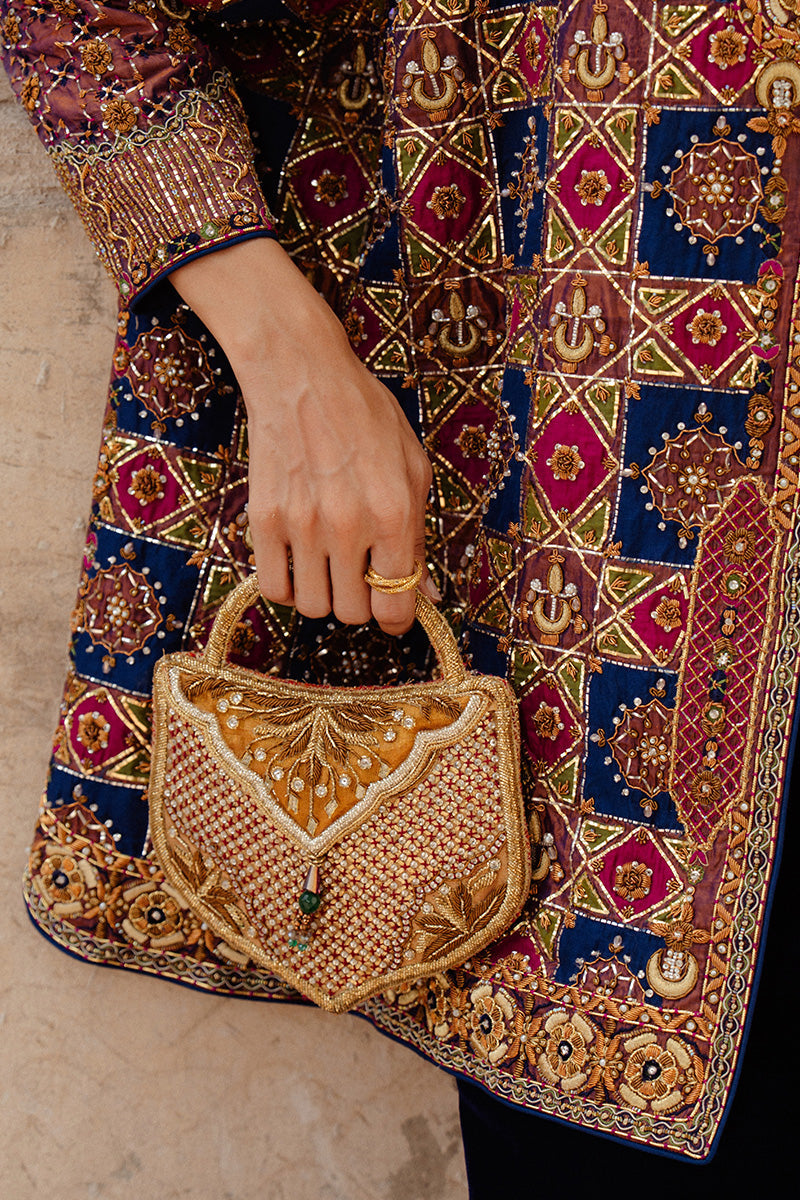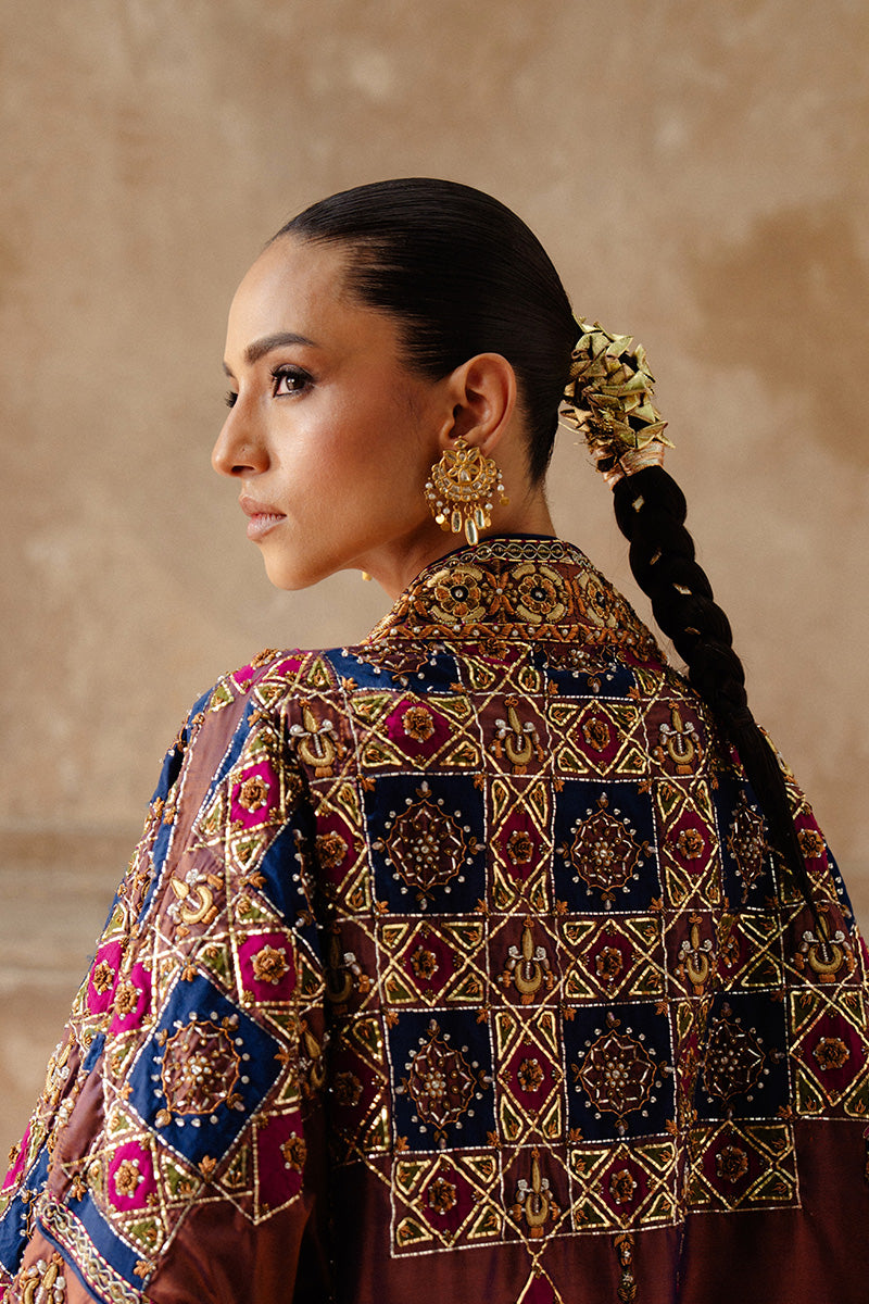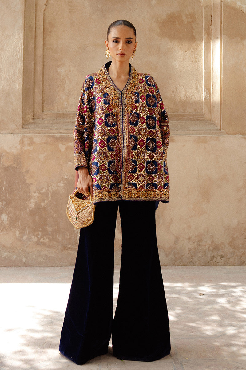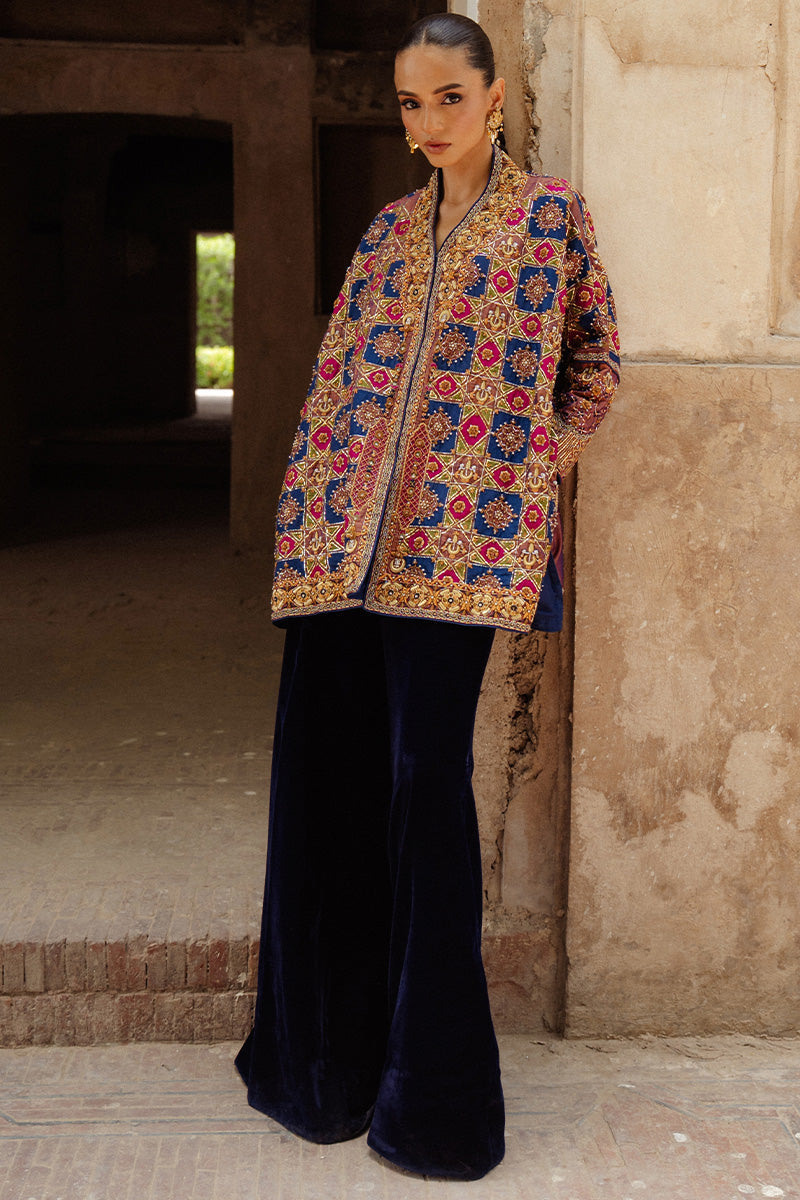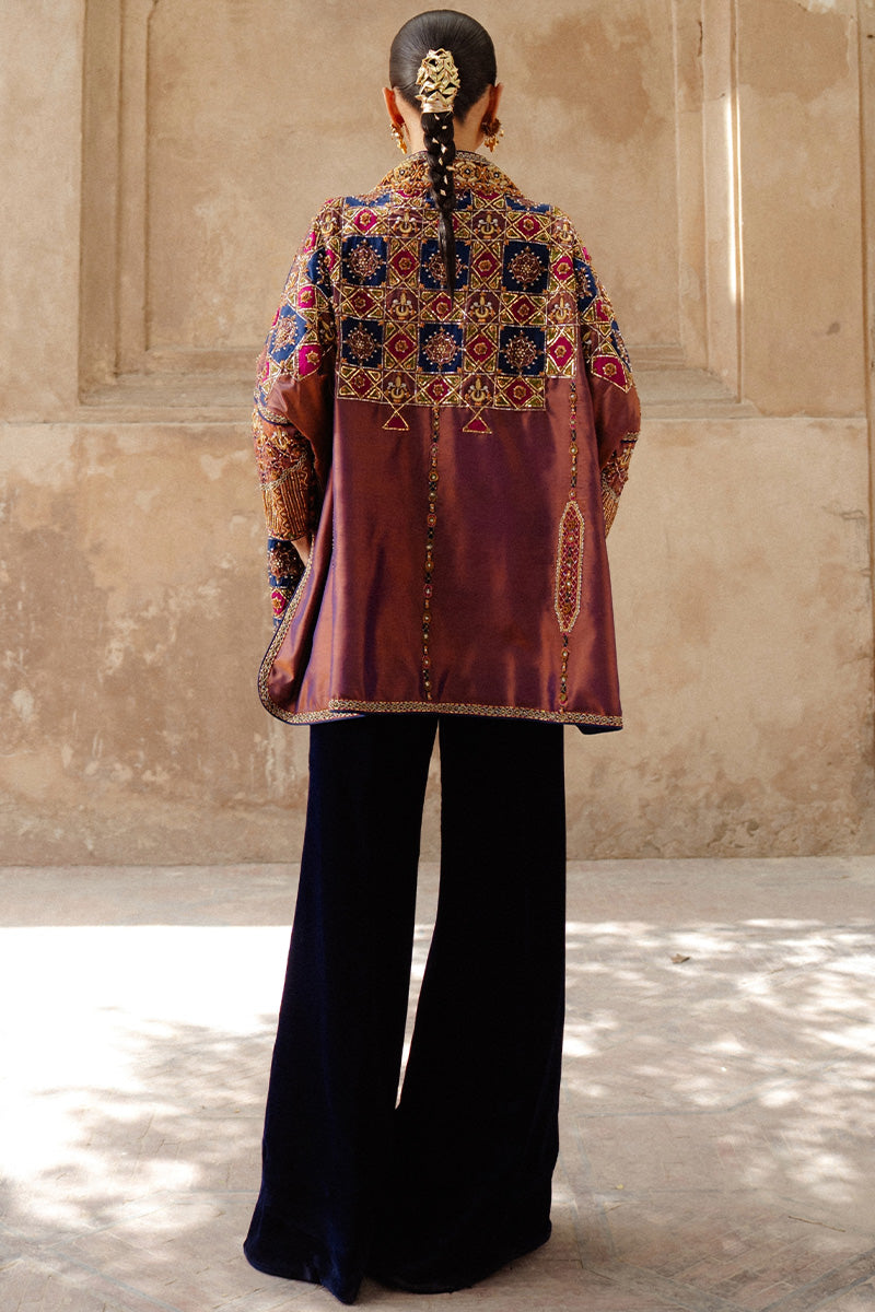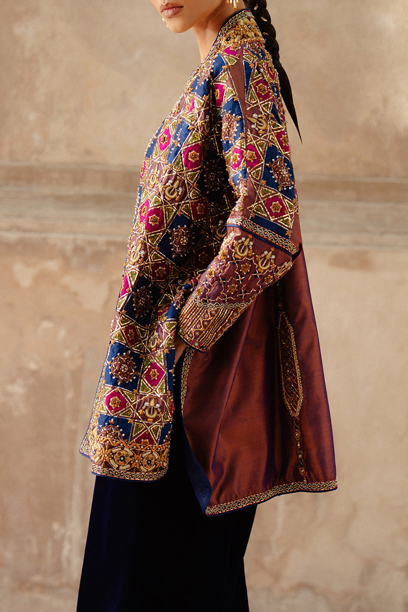 A statement patchwork jacket inspired by Islamic architectural artistry, Rania features rich, dark tones of magenta, navy and green arranged in a striking composition. The jacket is intricately adorned with chaandbali motifs and Mukesh taar work, laid out in an elaborate jaal pattern that adds depth and texture. Gold and copper zardozi embroidery further enhances the design, bringing old-world opulence into a contemporary expression.