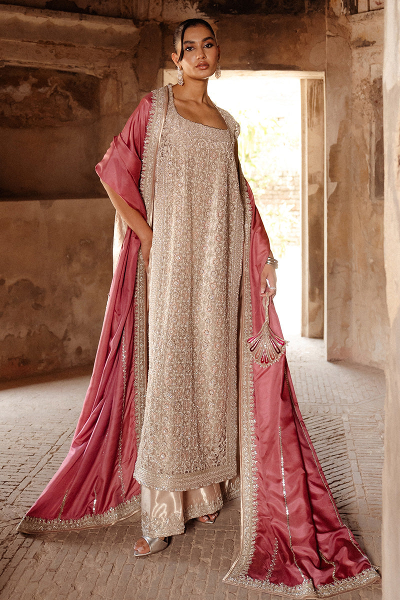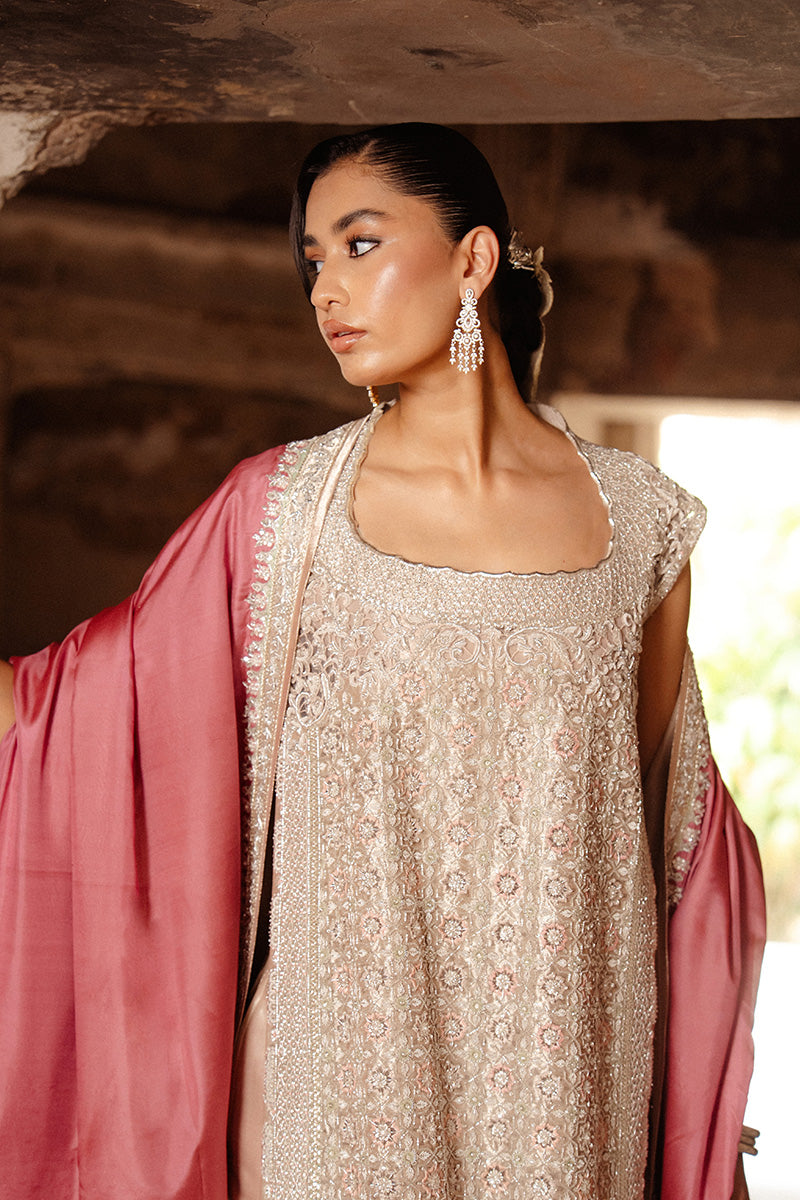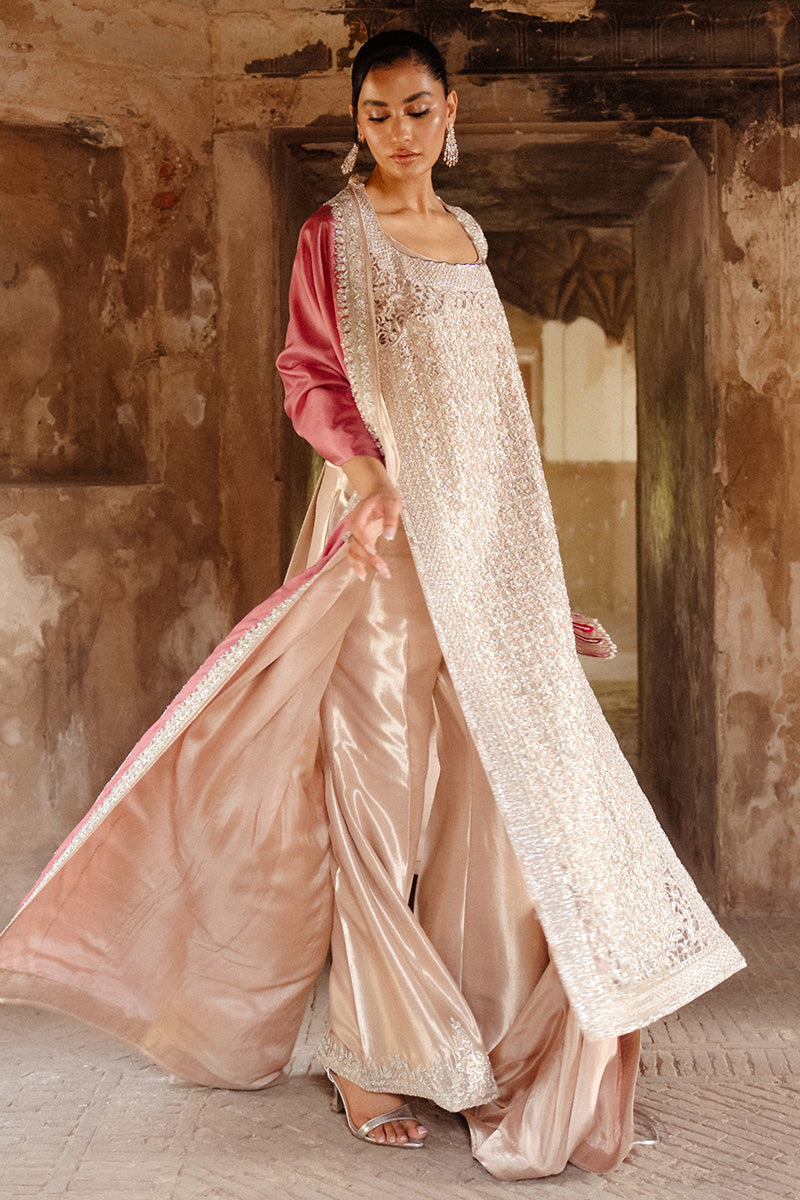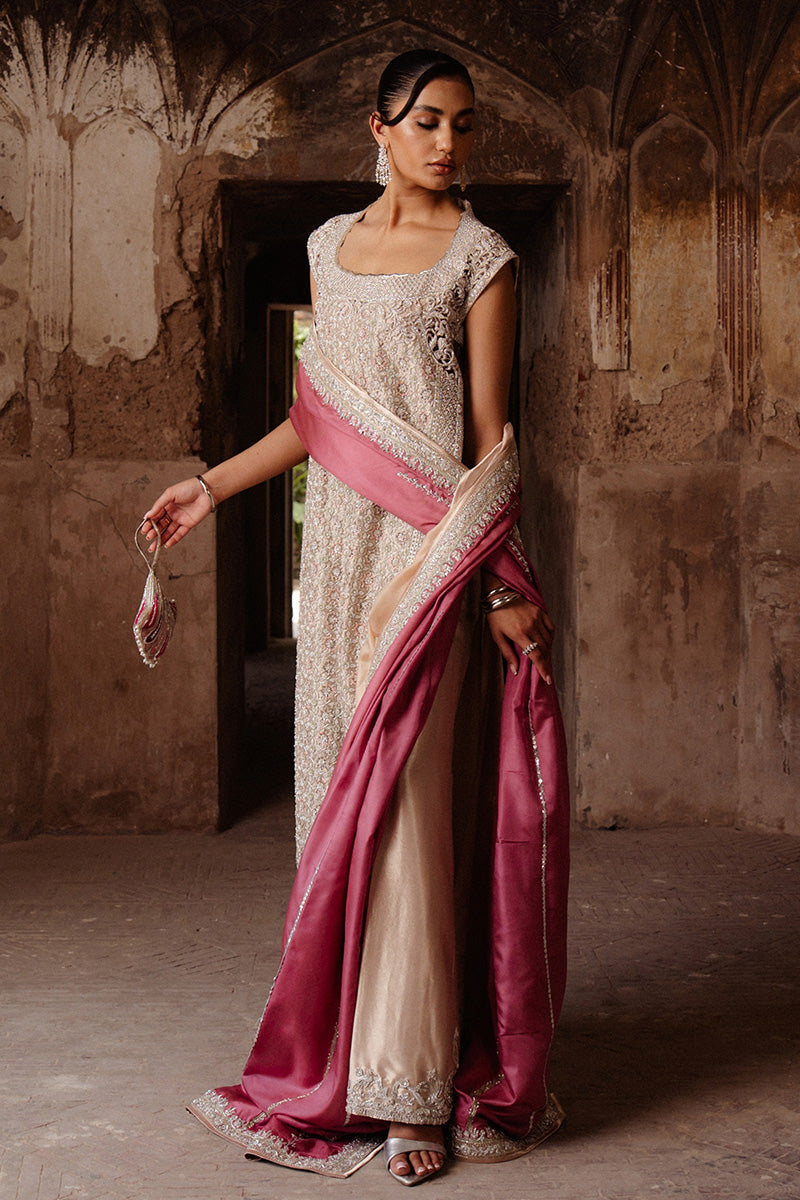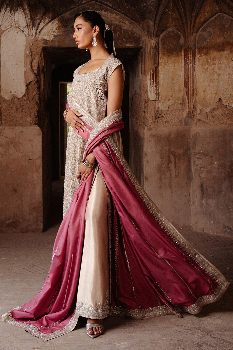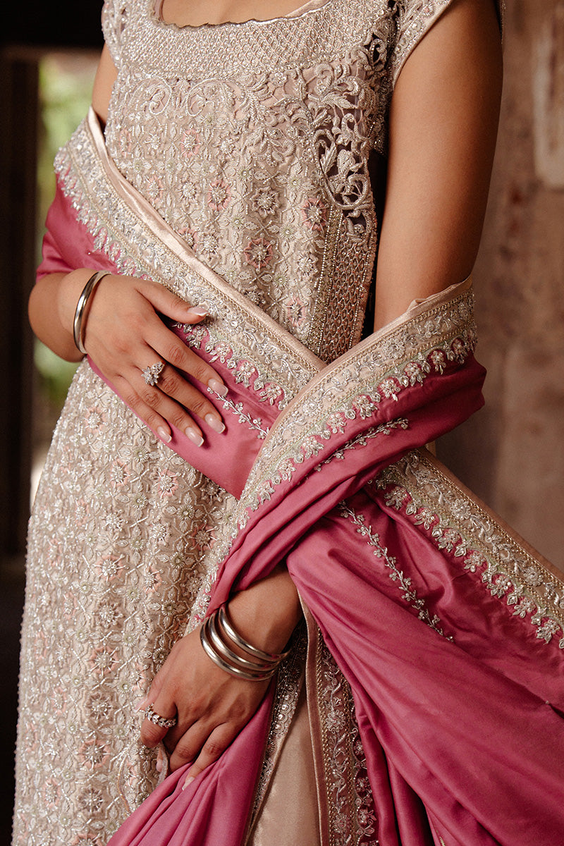 The ensemble is completed with a rich katan silk dupatta in a contrasting rosepink hue, creating a balanced interplay of softness and structure. Designed for evening receptions and formal events, Zeenat blends traditional artistry with contemporary luxury for a majestic, polished presence.