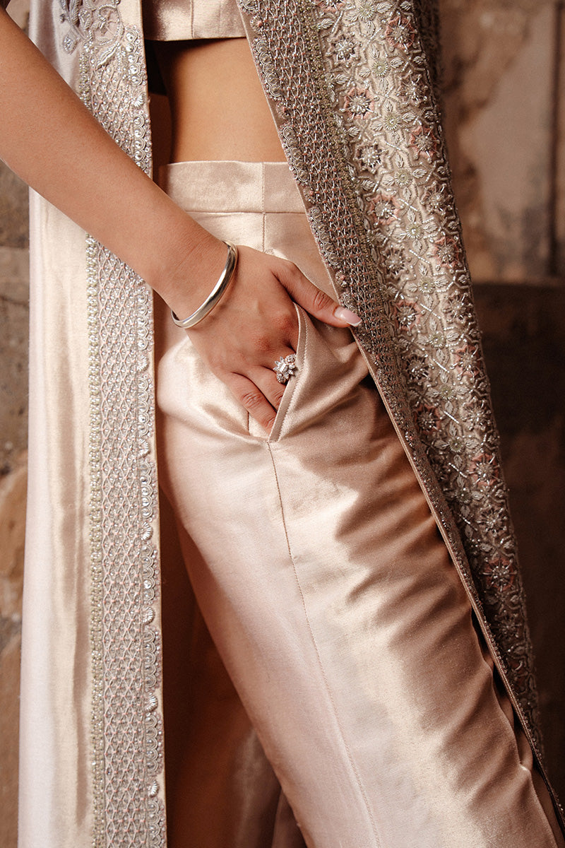 An ethereal heavy formal ensemble, Zeenat exudes refined elegance with its shirt and izzar crafted in luxurious lame' fabric, fully embellished with Swarovski accents and silver threadwork. The front panel of the shirt features a striking Islamic jaali pattern, elevated with intricate cutwork detailing that adds depth, dimension, and a regal finish.