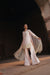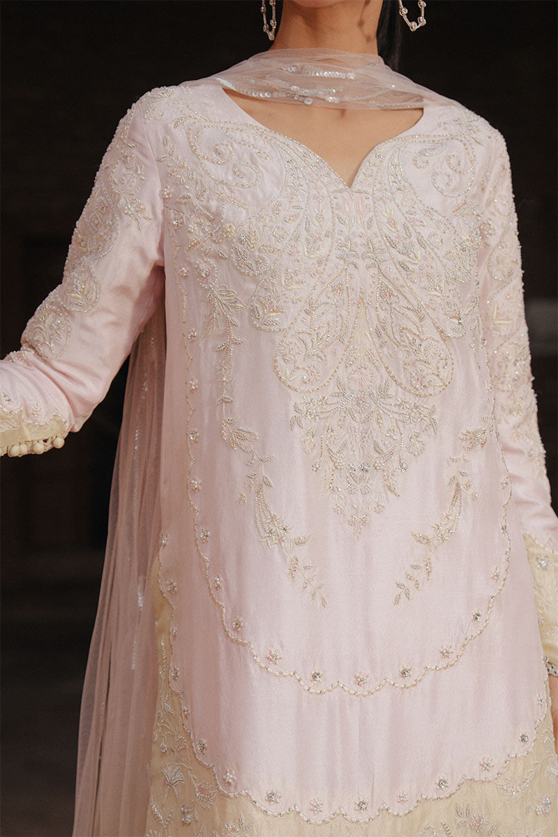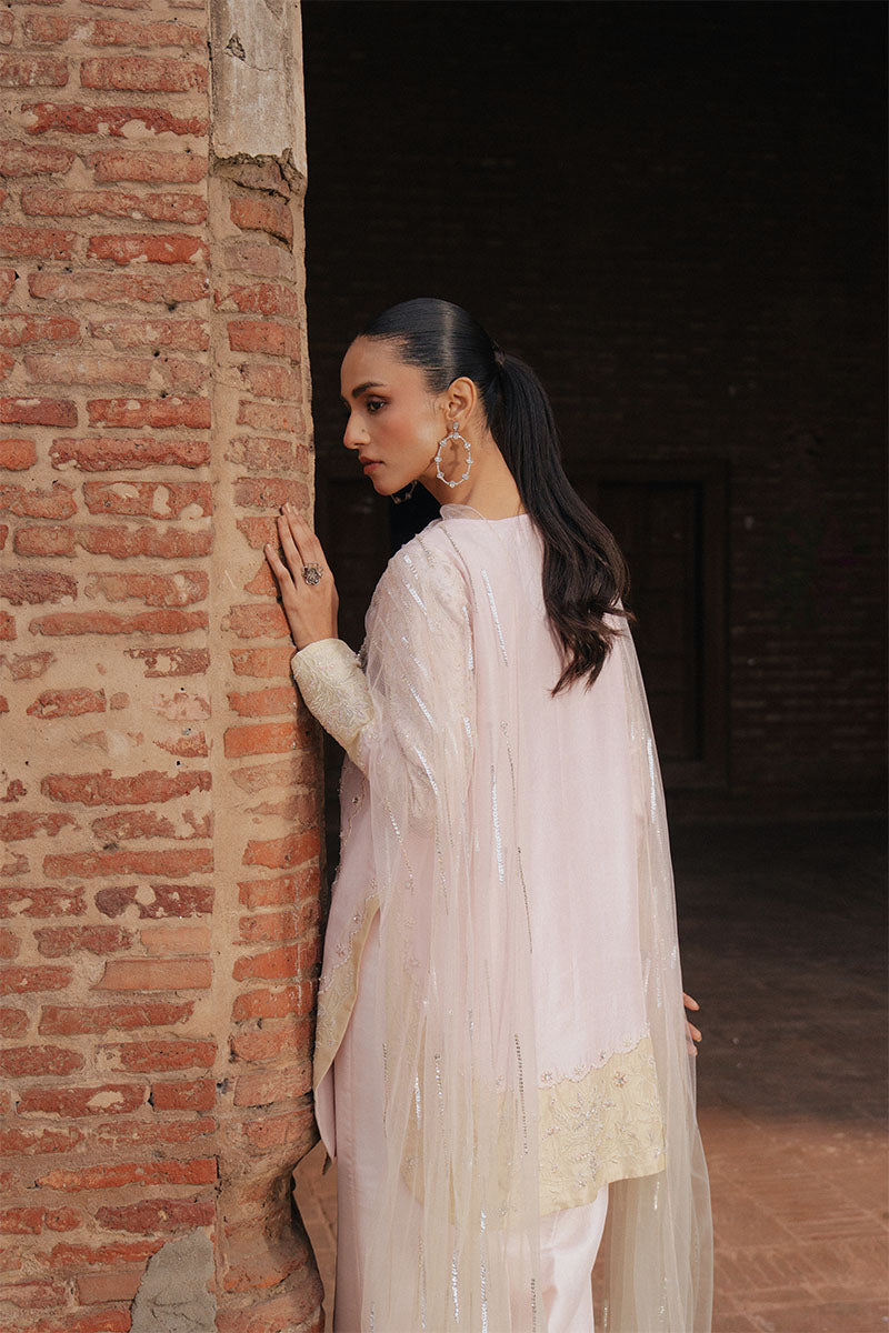 Paired with tailored boot-cut pants, the ensemble balances grace with structure. A super-long dupatta flows in delicate ombré hues with a linear pattern, adding movement and understated drama. Designed for graceful daytime occasions, AMILA embodies timeless sophistication with a carefree, effortless appeal.