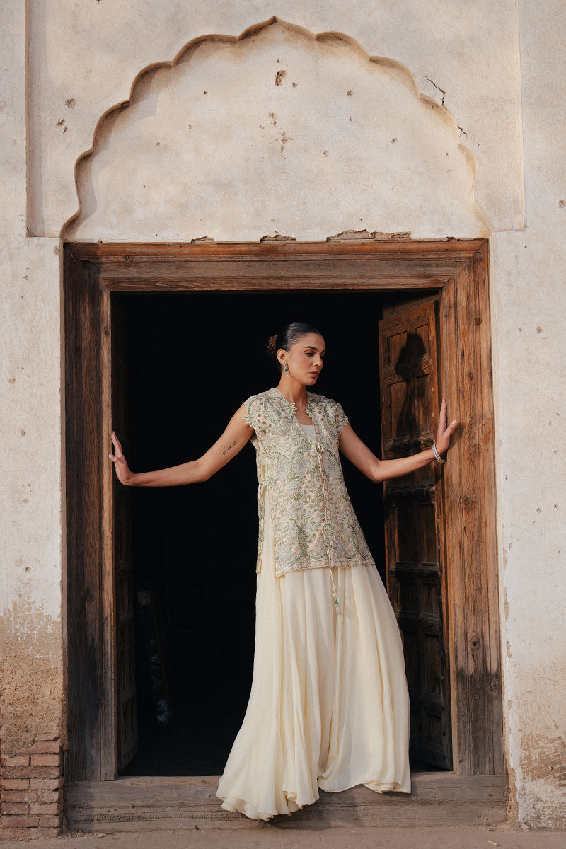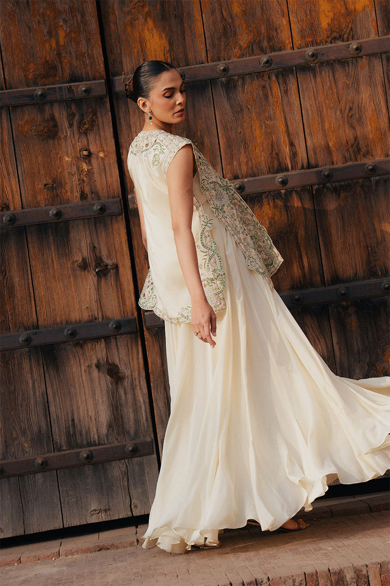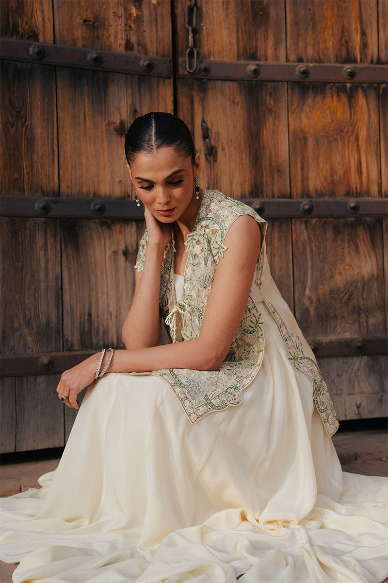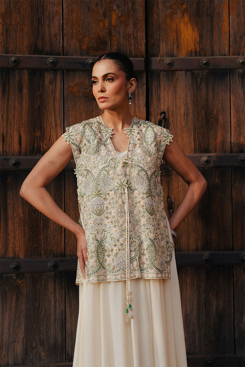 NIVA is a modern, fluid silhouette designed for effortless summer elegance. Rendered in a light butter yellow, a softly draped inner dress flows with ease, layered beneath a short gilet adorned with delicate cutwork detailing. Subtle shimmer catches the light as evening settles in, adding a quiet sparkle without overpowering the look.