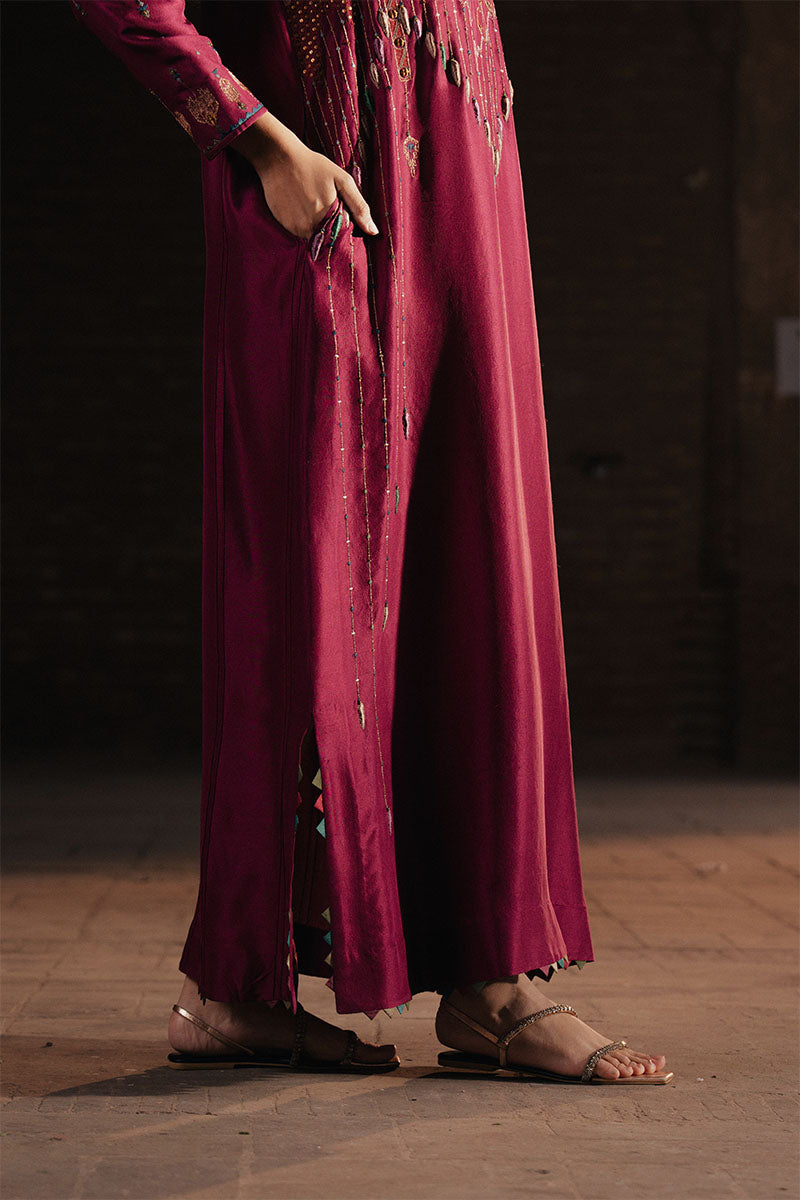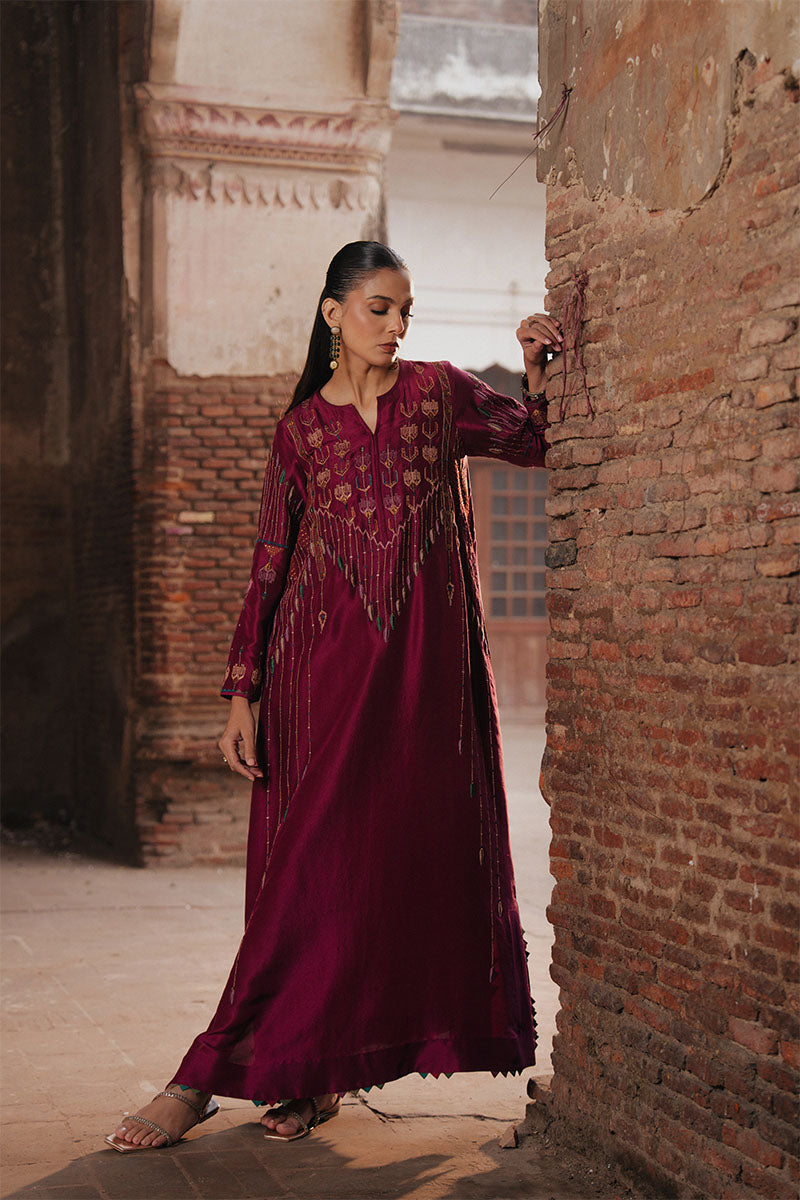 Draped in deep burgundy magenta, TALIN flows with quiet grace. Fine reesham and warm copper tilla embroidery trace delicate paths across the silhouette, adding depth without excess. Fluid on the body and gentle in presence, this kaftaan makes a subtle statement, perfect for intimate gatherings and moments shared with loved ones. Designed to feel effortless yet considered, TALIN kaftan is elegance that lingers, never loud, always remembered.