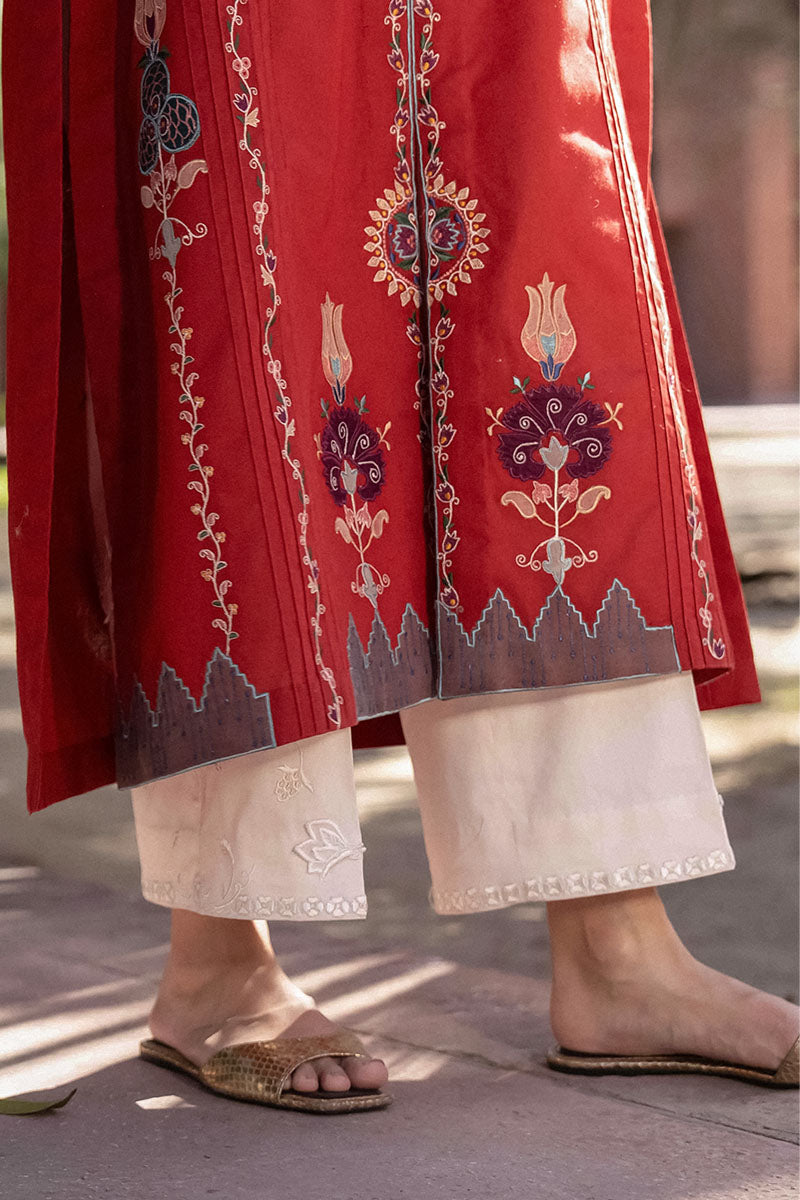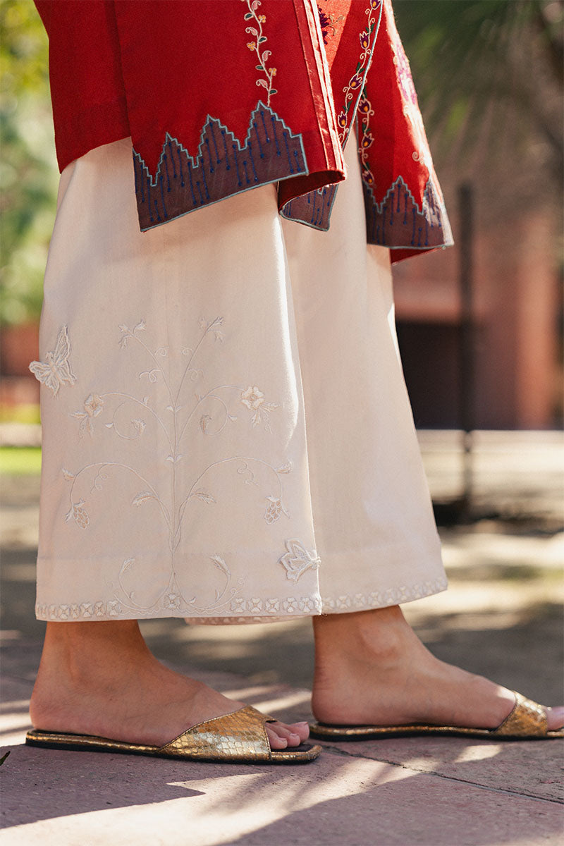 Elaar Izzar features embroidered detailing along the hem, extending gracefully along the sides. Crafted in a breathable cotton base with delicate machine embroidery, it is perfect for effortless summer dressing.