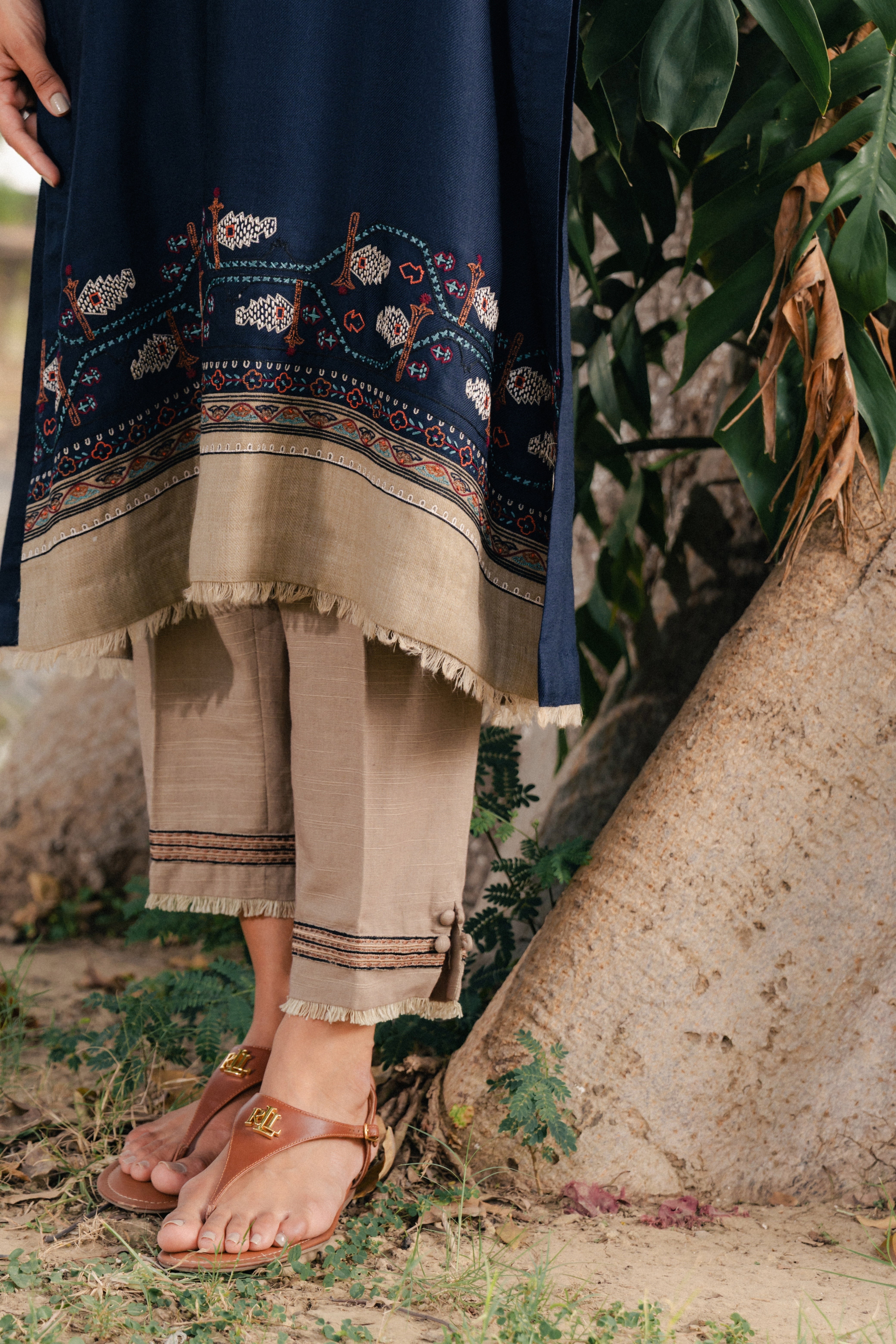 Maati Pant is a straight-fit khaddar trouser rendered in an earthy, soil-inspired tone. Finished with embroidered border detailing, soft frayed edges, and loop-button accents along the side, the silhouette feels grounded yet refined.