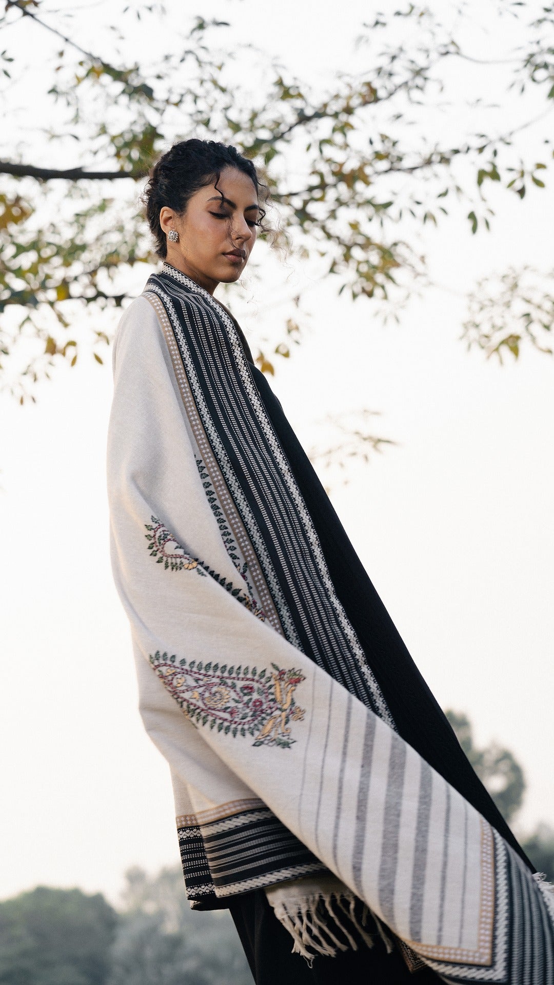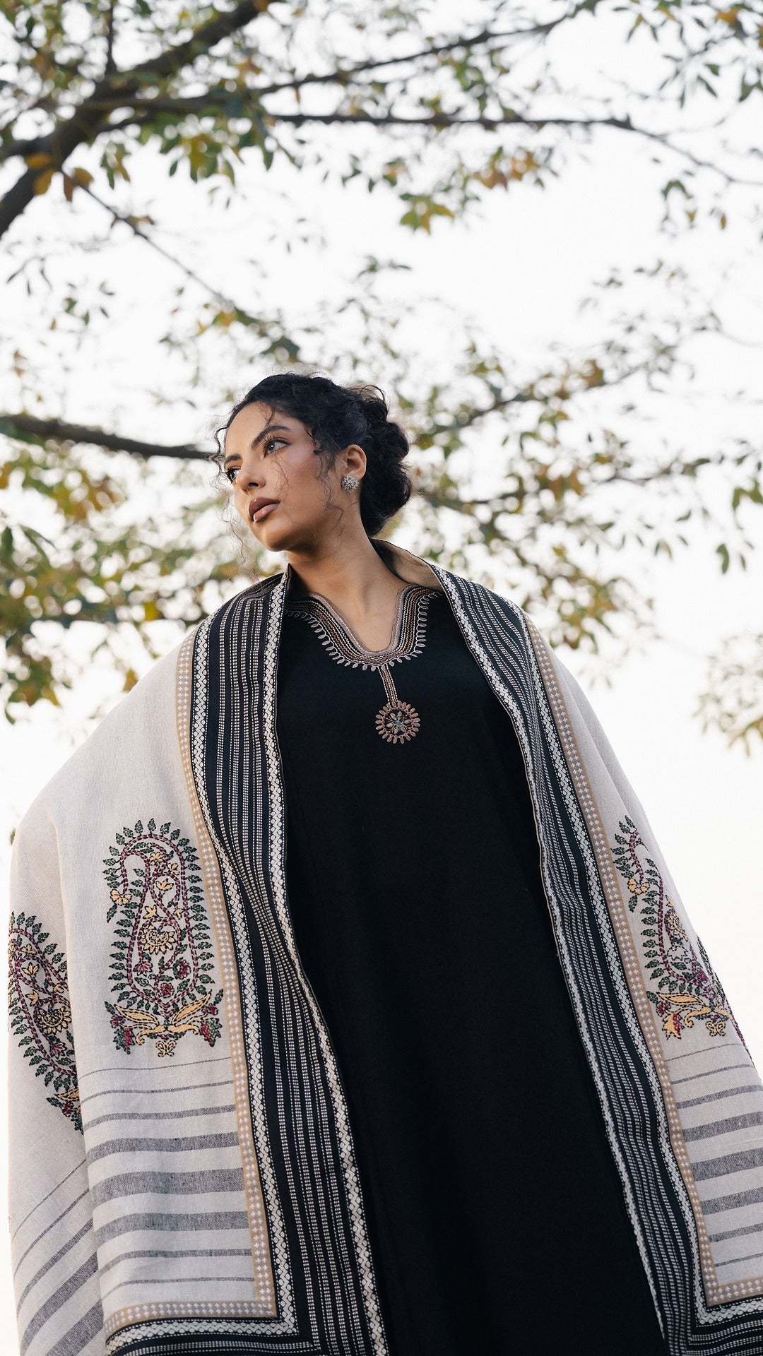 A handwoven woolen chaddar crafted on a khadi base and lined with soft wool, woven to hold both texture and comfort. The double-sided weave carries traditional ambi embroidery on the pallus, framed with patterned borders in earthy tones. A timeless winter essential — Chaddar wraps warmth in tradition, echoing the rhythm of hands that wove and embroidered it, stitch by stitch.
