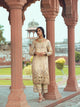 Timeless elegance that is eternal; a pure Katan Organza pishwas in Deep Pink; intricately embellished with zardozi, kaamdani and resham work. This bridal is paired with a traditional pure Jamawar gharara in dues hues with a light signature designed border. The look is completed with a pure Chiffon gold zari draped dupatta, decorated with heavy jaal and floral border in zardozi and hand resham work.