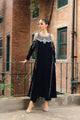 An opulent plum velvet creation featuring patchwork on organza, enriched with all-silver embellishments and delicate tassel detailing. The straight long shirt is paired with elbow-length floral-detailed sleeves, a crushed velvet sharara for volume, and a sheer organza dupatta embellished with Swarovski and crystal work. A timeless piece that captures elegance with modern finesse.