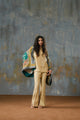 The Tira kaftan is rendered in sand-toned raw silk, digitally printed with an abstract floral composition. This long kaftan features a modern tie detail and is delicately adorned with stonework that adds a refined shimmer. The neckline is elevated with handcrafted detailing, bringing depth and artisanal character to the silhouette. Paired with pleated loose pants, the Tira kaftan is a timeless ensemble designed to be worn season after season.