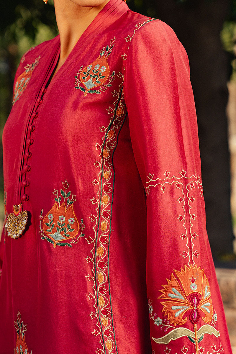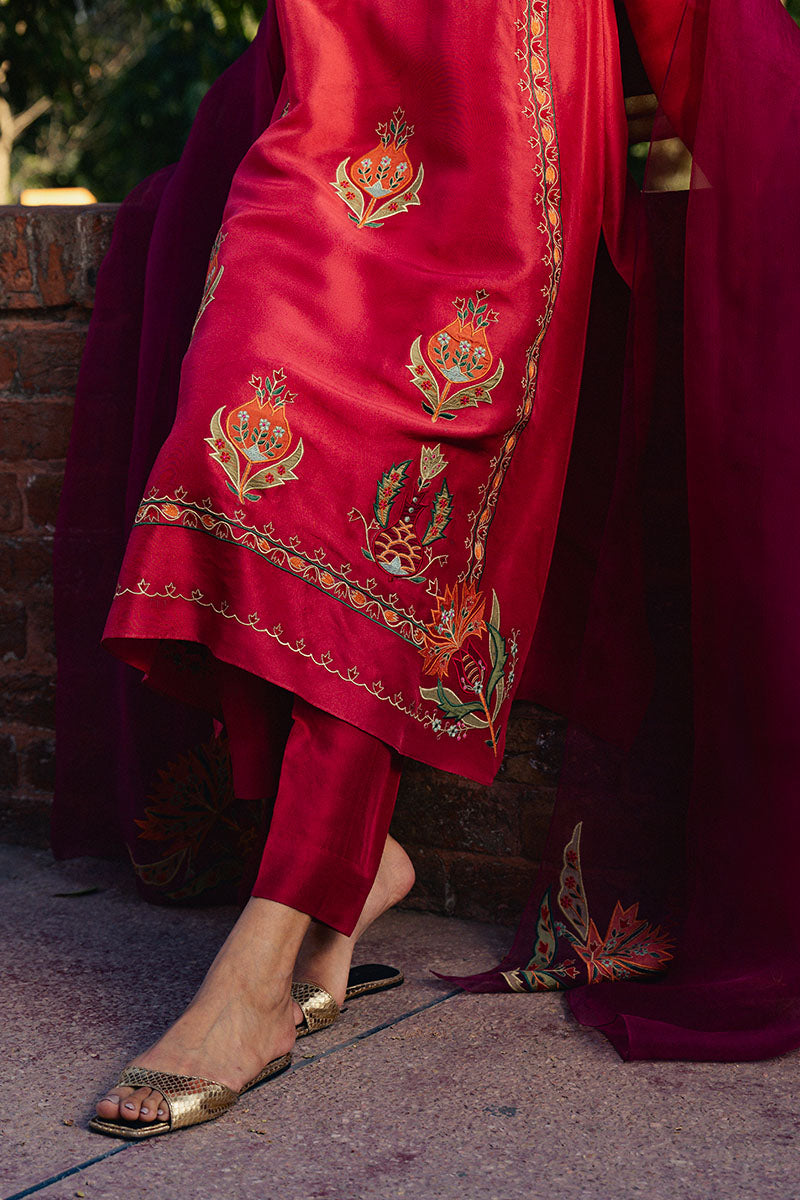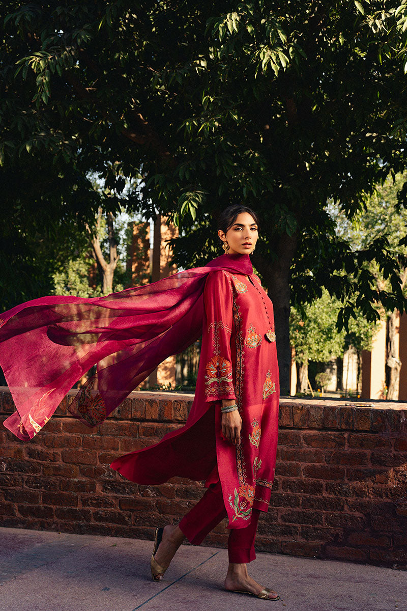 Inspired by the Turkish motifs, the rust keepsake is tailored in pure Raw Silk featuring applique and fine embroidery all over the front and sleeves. The set is paired with a patchwork Organza dupatta and an embroidered pure Raw Silk Izaar.