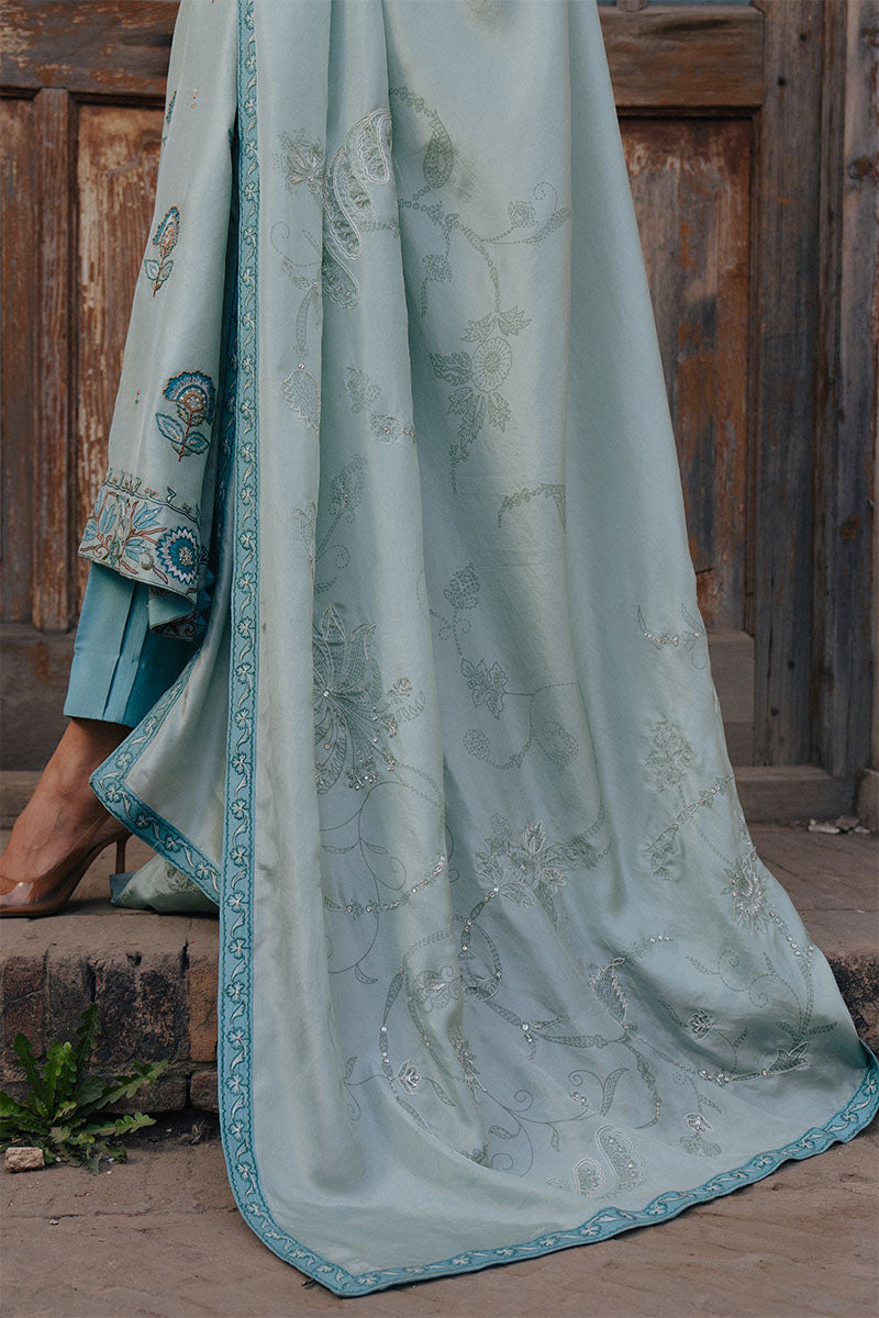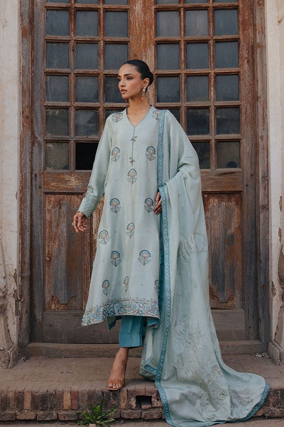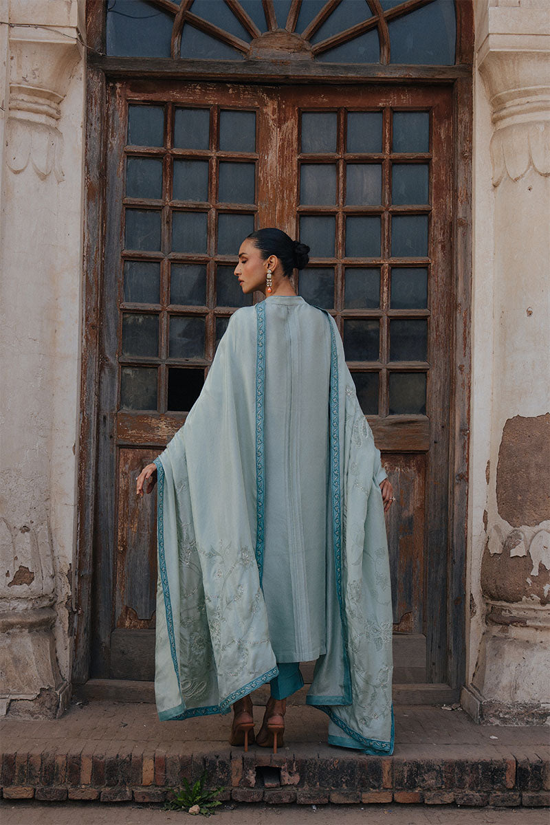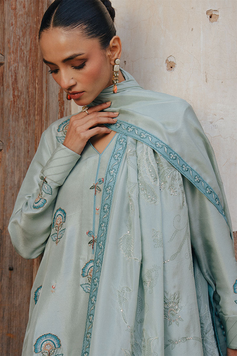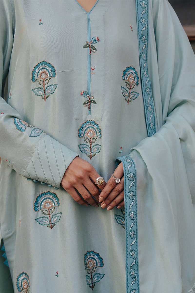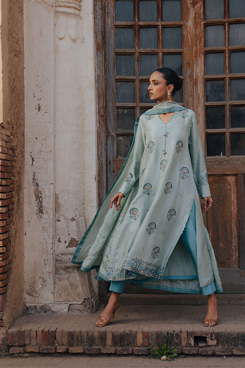 The look is paired with a medium silk printed dupatta, finished with light embellishment for a soft hint of shimmer. Effortless yet festive, AASMA is designed for warm days, intimate gatherings, and moments that call for understated elegance.