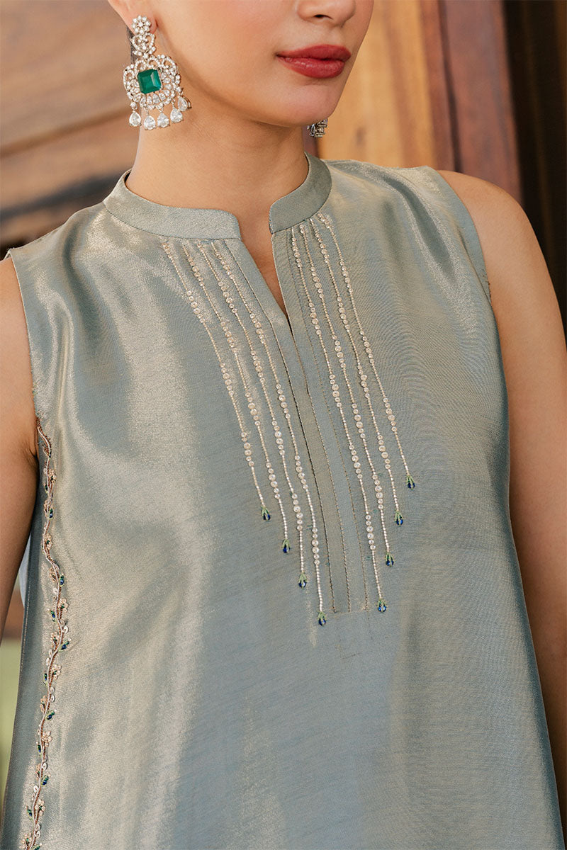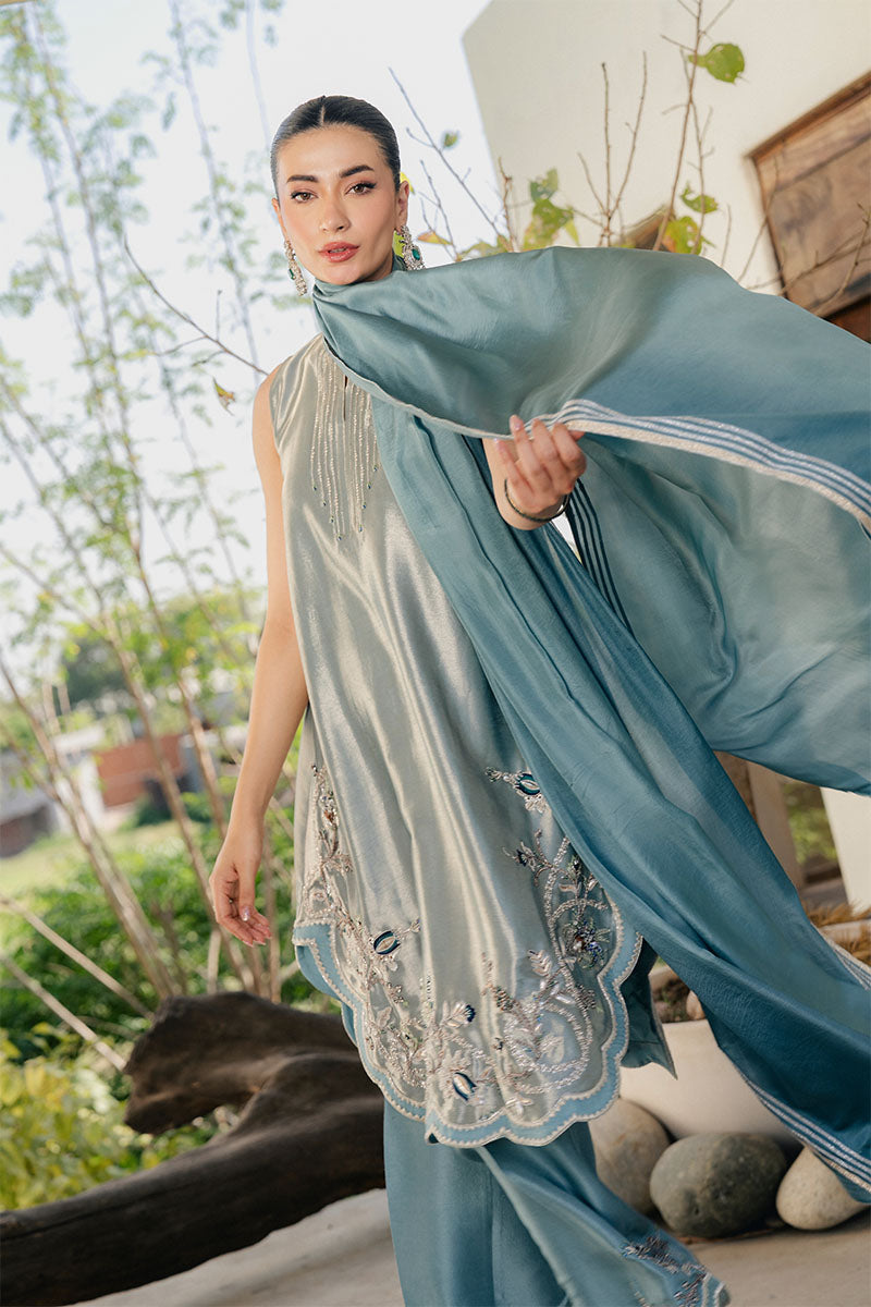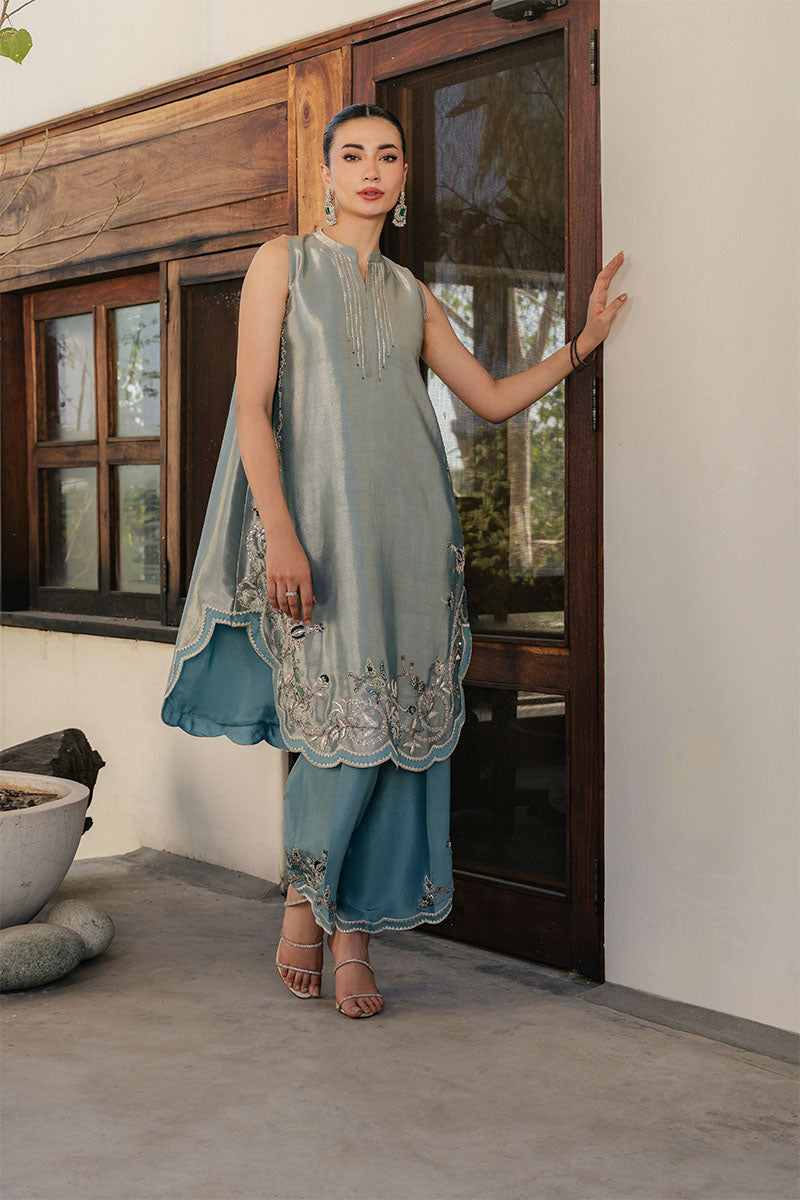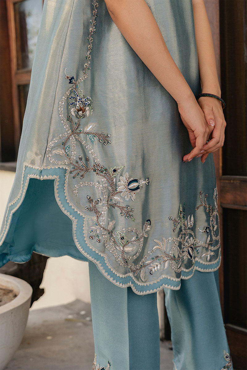 Step into the spotlight with this luminous earl blue lame shirt, featuring an elegant scalloped hem adorned with intricate floral Swarovski work. The shimmering texture of the lame is perfectly grounded by raw silk pants, finished with a detailed, embellished border for a cohesive look. A medium silk dupatta with traditional gota edgings adds a touch of heritage charm and fluid movement to the outfit. Combining modern shimmer with classic hand-craftsmanship, this fun yet sophisticated ensemble is the ultimate choice for light weddings and festive celebrations.